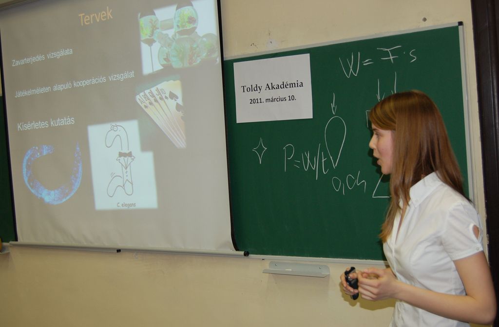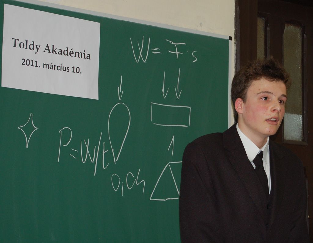 A Toldy Akadémia 2011. évi ülését március 10-én, csütörtök délután tartottuk meg. Hárman pályáztak az akadémiai tagság elnyeréséért: Kerkovits Nóra a kolerajárványok történetéről, Marosi Gabriella a sejtek öregedéséről, Székely Gellért a kerékpárok aerodinamikájáról tartott előadást. A tekintélyes zsűri Marosi Gabit választotta meg az akadémia tagjának. A közönségdíjat Kerkovits Nóra kapta. Igazgatói különdíjban Székely Gellért, a zsűri elnökének és a zsűri diáktagjainak különdíjában Kerkovits Nóra részesült.
