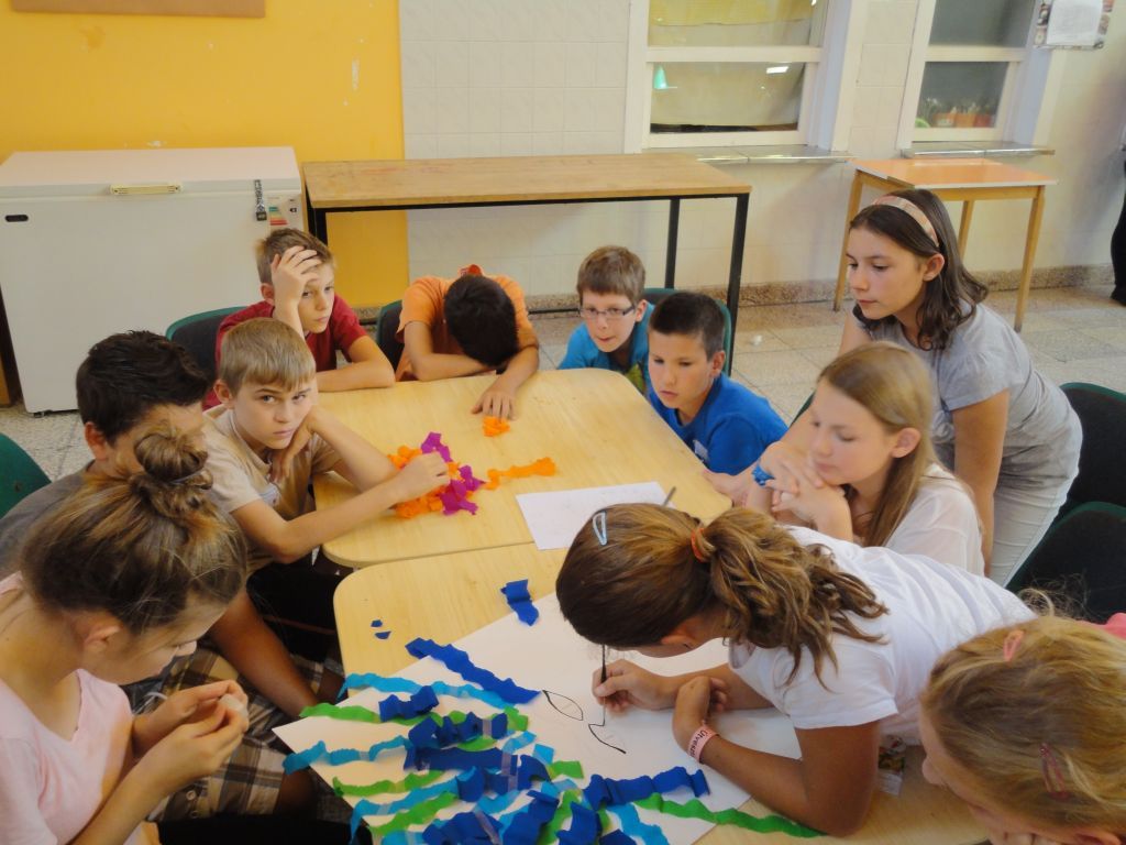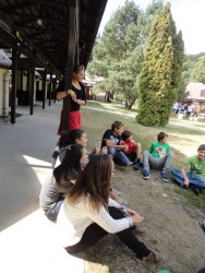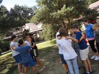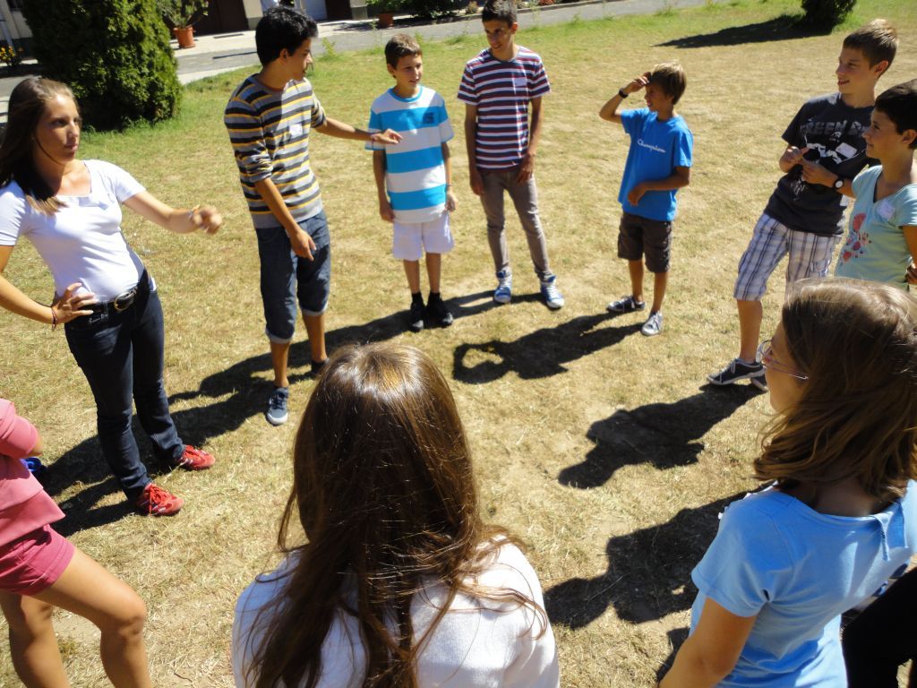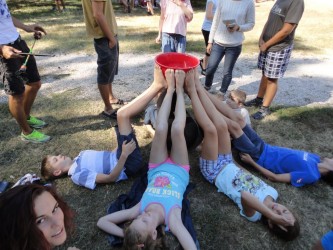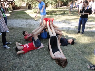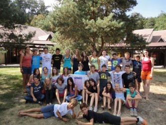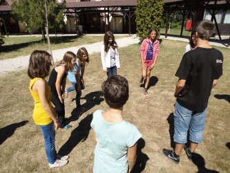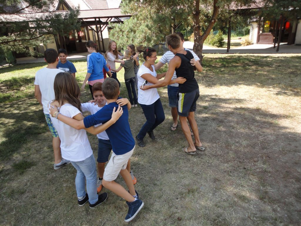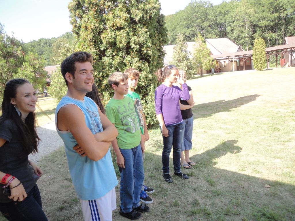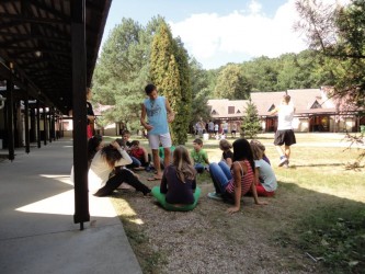 És még folytathatnám, hogy "a második napon az történt, hogy...", de ellenállok a kísértésnek, és próbálom rövidre fogni. A következő napokban annyi programon vettünk részt, hogy az kimerítette egy egész havi programszükségletünket. Meg persze, kimerített MINKET is, és erre még rátett egy lapáttal a reggel hétkor kelés, a néha fülünkbe üvöltő megafonnal, néha (és szerencsénkre általában) lágy gitárszóval. A programok között volt pl. számháború az erdőben, sportversenyek, éjszakai bátorságpróba, görög mitológia előadása sci-fiben, musicalben, esetleg talkshowban (nem vicc, volt szappanoperában is), ZTM (Zenés Táncos Mulatság)... Nekem például az is tetszett, amikor az A-s fiúk a B-sek ellen játszottak le egy focimeccset úgy, hogy a lányok közben mindkét oldalon pomponlányokként szurkoltak nekik, krepp-papírból készült pomponokkal, koreográfiával, biztató szövegeket kántálva. Jó, a végére már az egész átment egy "Pomponlányok harca-dologba"... :-)