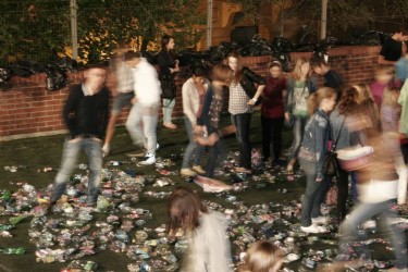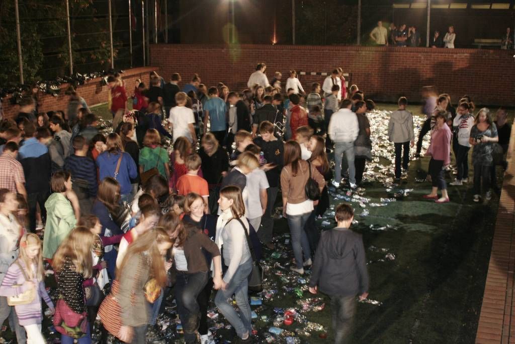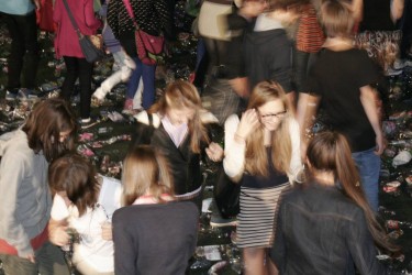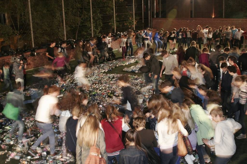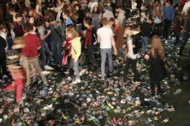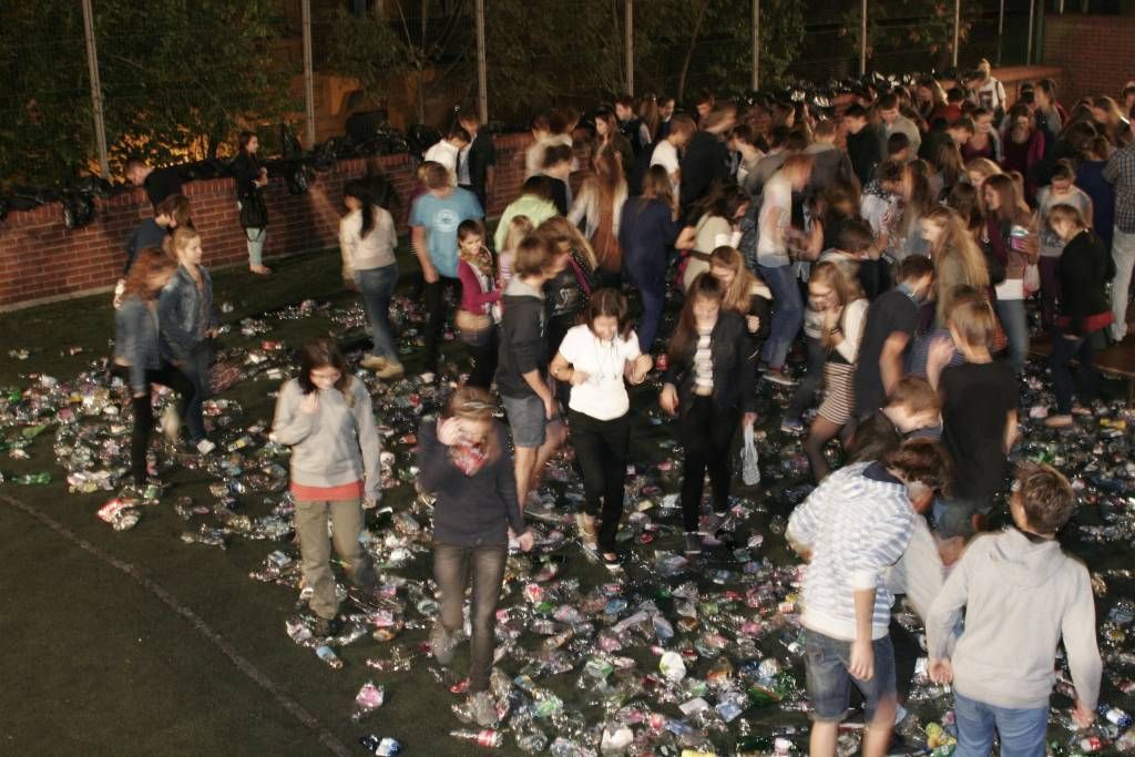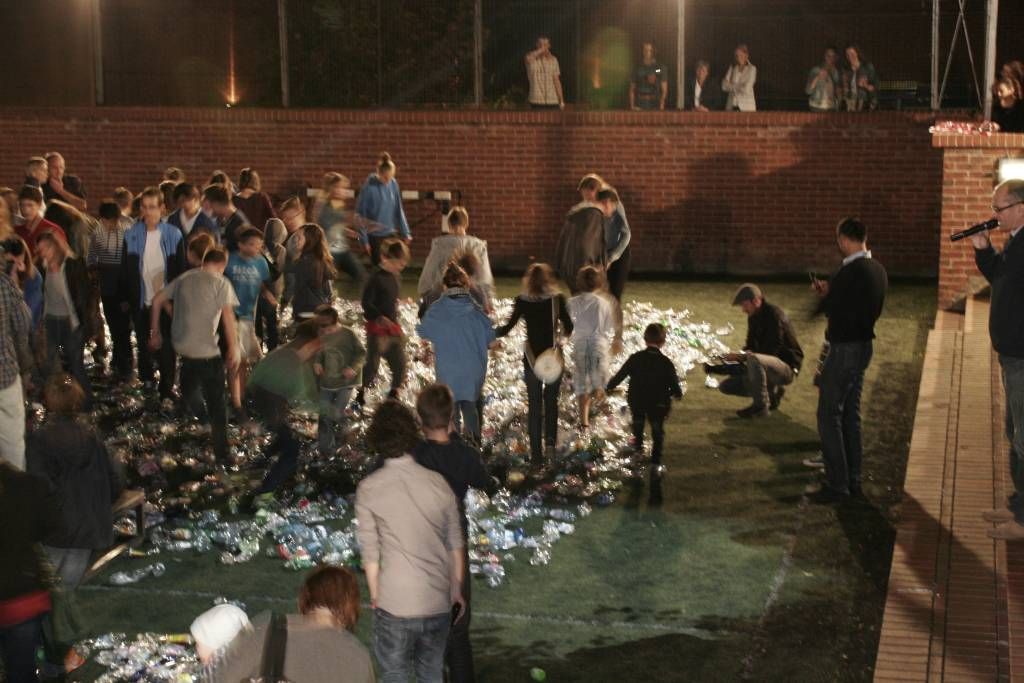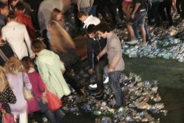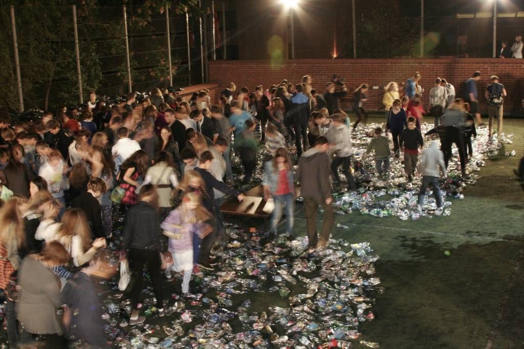 Este kilenckor kezdődött a „nagy taposás” Gundel Takács Gábor vezetésével, amin nagyon sok ember részt vett, fiatalok és idősek egyaránt. Miután mindenki összetaposott mindent, újra beleraktuk a palackokat a zsákokba, de így már csak 24 zsákot töltöttek meg!!! Ezzel tökéletesen illusztráltuk, hogy mennyi helyet meg lehet spórolni a palackok összenyomásával. :-)