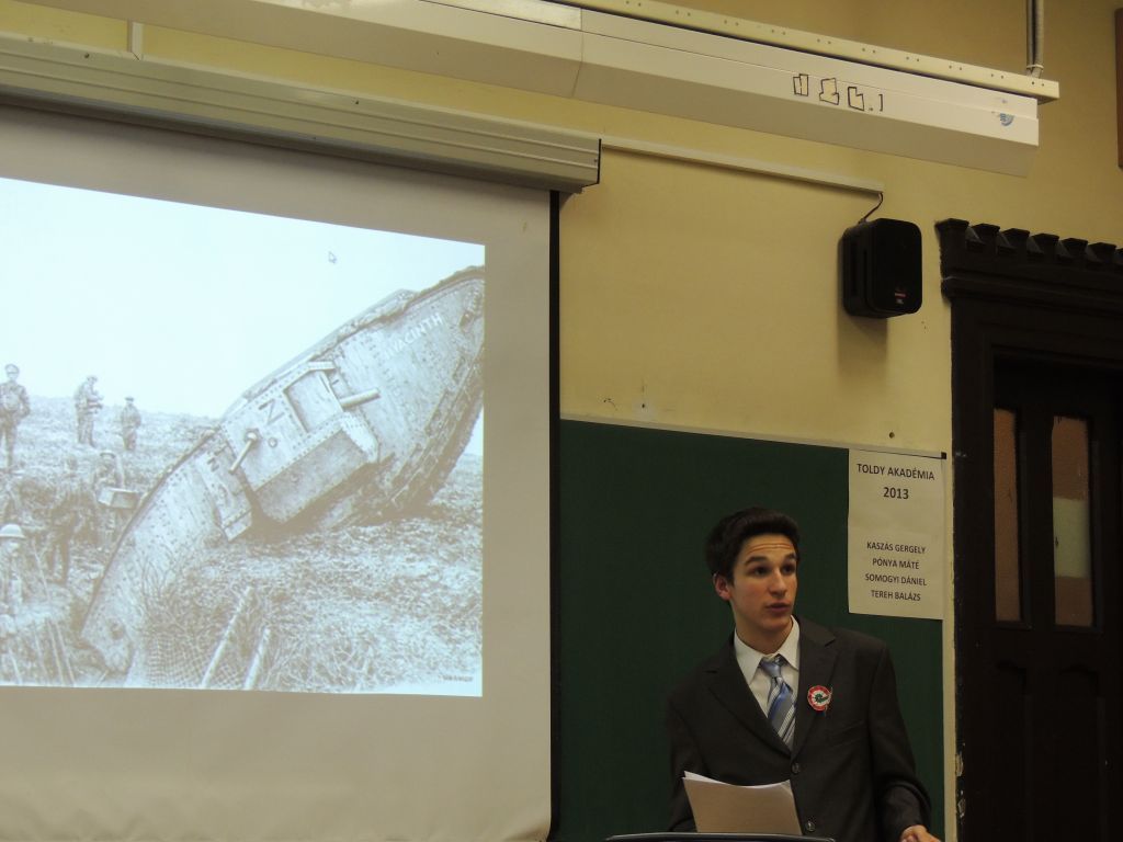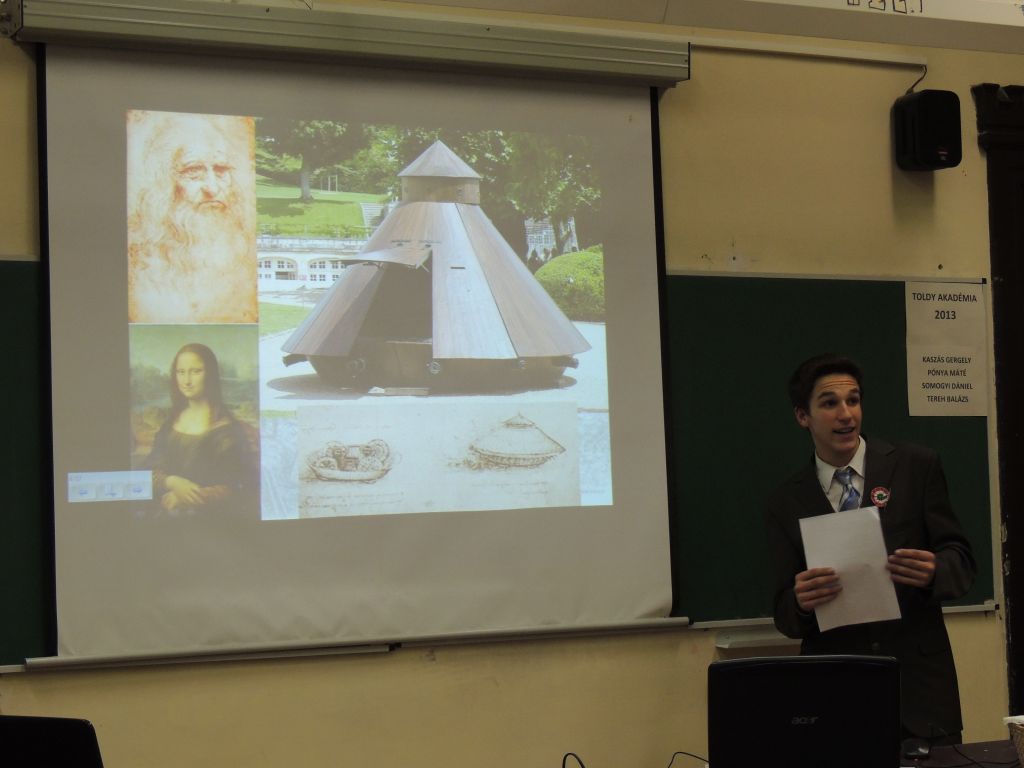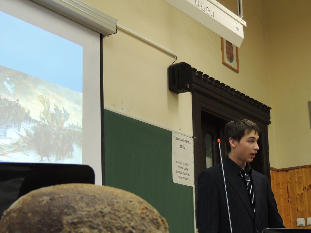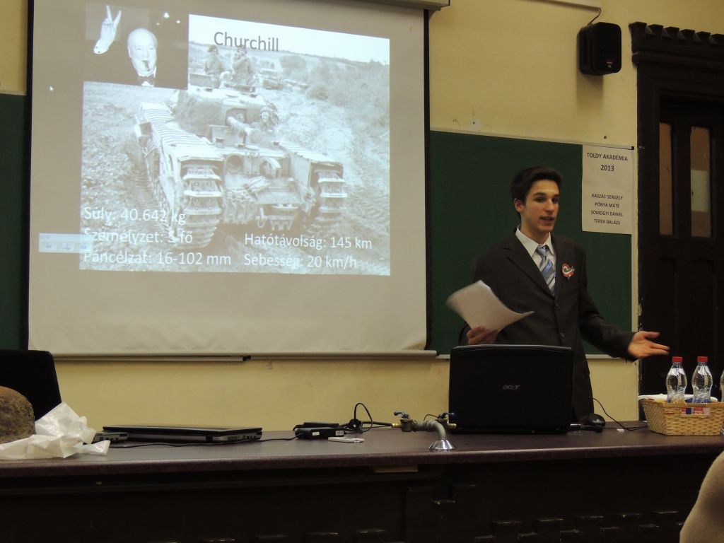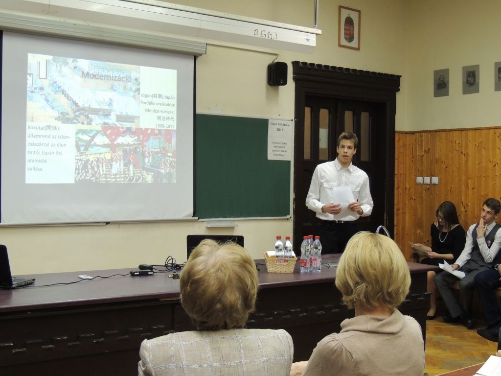A Toldy Akadémia 2013. évi ülését március 14-én, csütörtök délután tartottuk meg. A zsűri elnöke idén is Dr Alföldy Ferenc, iskolánk egykori diákja, Állami-díjas orvosprofesszor volt. A tekintélyes zsűri tagjai voltak: Wakai Seiji, a Károli Gáspár Református Egyetem Bölcsészettudományi Karának tanára, a Japanológia Tanszék munkatársa, Dr Számvéber Norbert őrnagy, hadtörténész, a Hadtörténeti Intézet és Múzeum munkatársa, levéltárvezető, Porogi András, iskolánk igazgatója, továbbá Kerkovits Nóra Melinda, a 2011. évi akadémiai ülés közönségdíjas előadója.