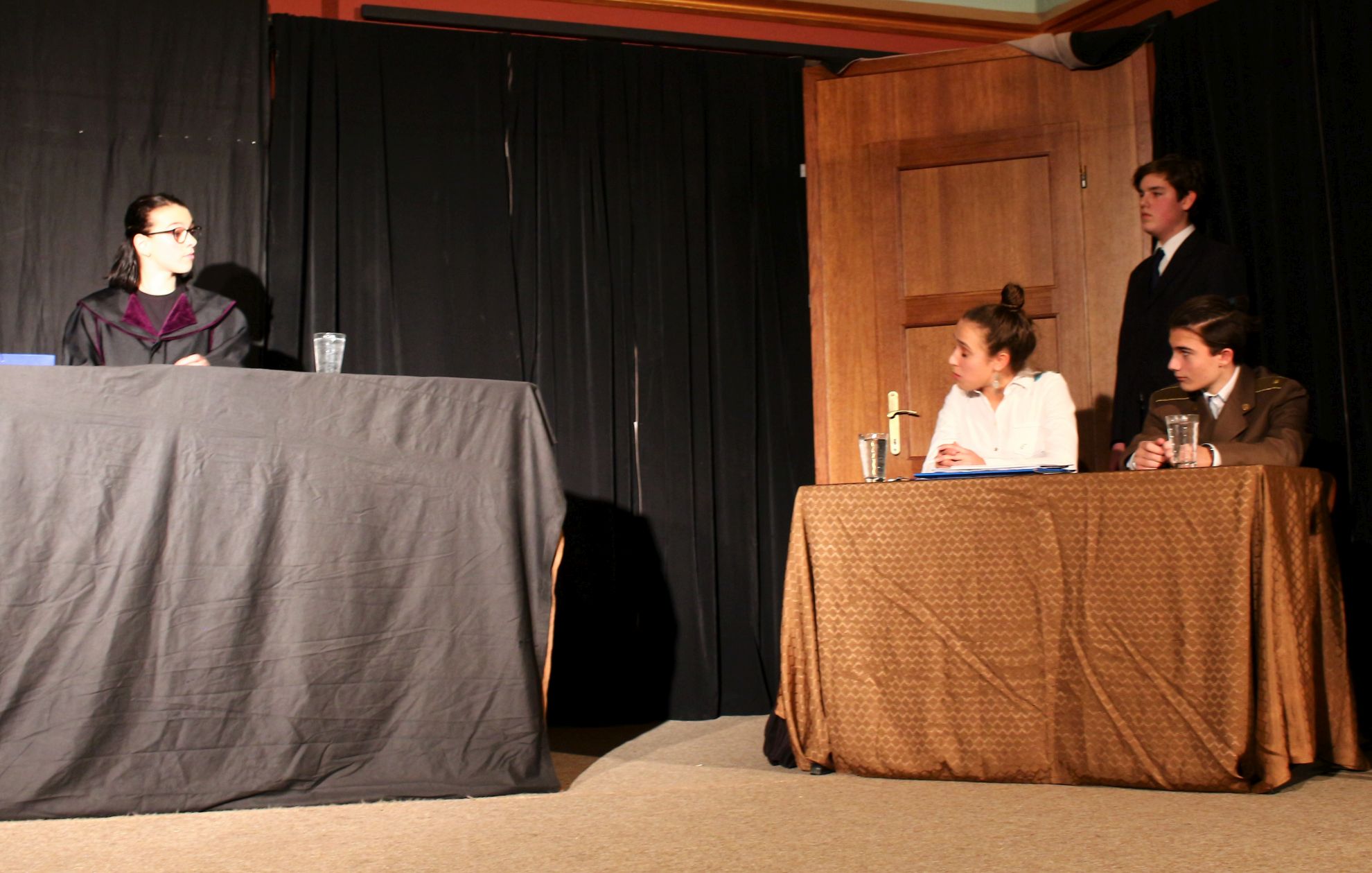 Négy szereplő is volt, aki a darab teljes hossza alatt a színpadon tartózkodott: a már említett vádlott, a bírósági elnök (Lökkös Júlia), az államügyésznő (Nagy Lili), illetve a védő (Kovári Lilla). Nagy érettségre vall, hogy a felsorolt diákok egy ilyen komoly bírósági tárgyalás idegőrlő hangulatát hitelesen át tudták adni. A tárgyalás egyébként száraz hangulata ellenére remekül elkülönültek a megjelenített karaktertípusok. A temperamentumos védő ellensúlyozta a tárgyilagos és racionalista ügyésznőt, Horváth Vilmos pedig jól láthatóan építette fel a darab kezdetétől fogva egy súlyosan vádolt személy karakterét. Mindezek mellett Lökkös Júlia kiválóan alakította a pártatlan bírót, ezzel enyhítve a többi szereplő közti feszültséget.