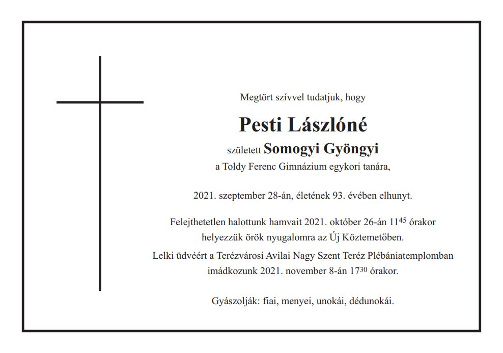 Szomorú szívvel tudatjuk, hogy iskolánk egykori tanára, Pesti Lászlóné, született Somogyi Gyöngyi, életének 93. évében elhunyt.