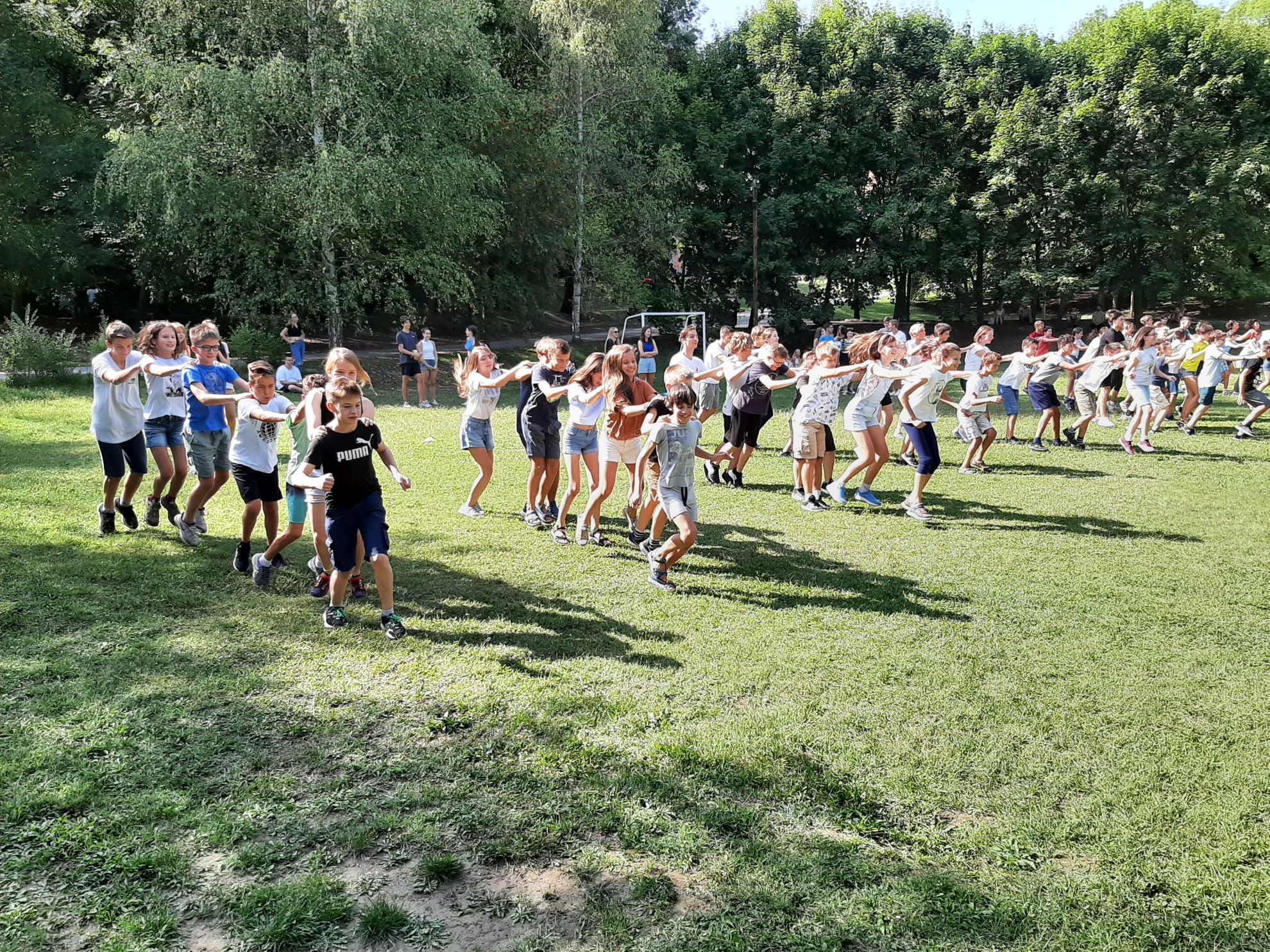 A délután hátralevő részét számtalan izgalmas játékkal töltöttük, majd vacsora, és jött az est fénypontja: a ZTM. Ez a Zenés Táncos Mulatság rövidítése. A végzősök itt megtanították nekünk az évek óta hagyományként ismétlődő fűnyírótáncot.