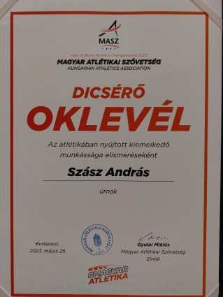 Szász András tanár úr egyetemi évei alatt szerzett bírói képesítést, és 2012-től lát el hivatalosan versenybírói feladatokat a hazánkban rendezett atlétikai versenyeken. A szövetség ezt az immáron több mint egy évtizede végzett kiemelkedő munkát ismerte el dicsérő oklevéllel.