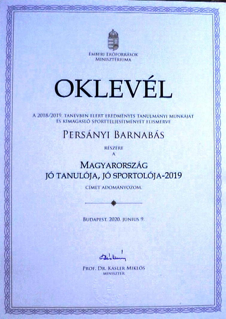 Persányi Barnabás (3. a) és testvére, Bálint - aki szeptembertől lesz a Toldy tanulója - is átvehette a Dr. Kásler Miklós, az emberi erőforrások minisztere által kibocsátott oklevelet.