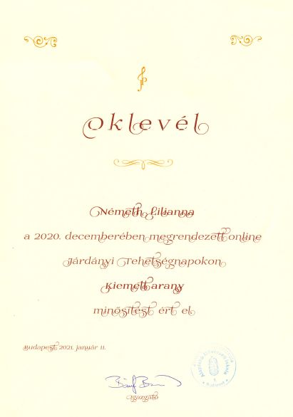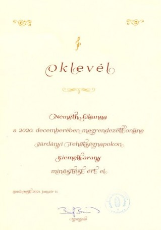Németh Lilianna (2. a) a Járdányi Tehetségnapok online rendezvényen ért el kiemelt arany minősítést.
