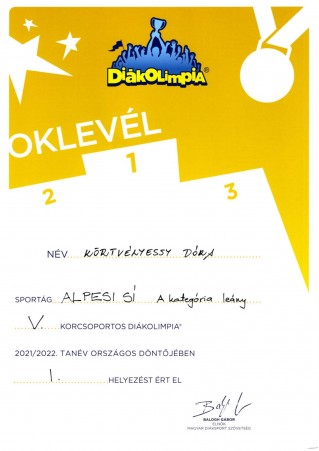 Dóri (3. a) az Alpesi sí Diákolimpia V. korcsoport "A" (versenyző) kategóriájában végzett az első helyen.